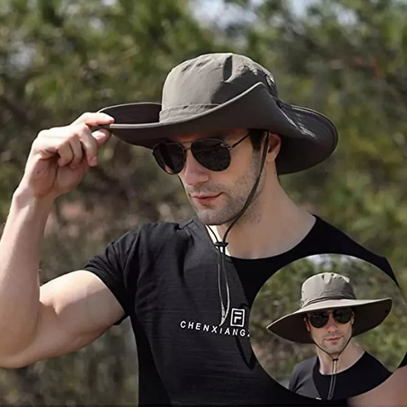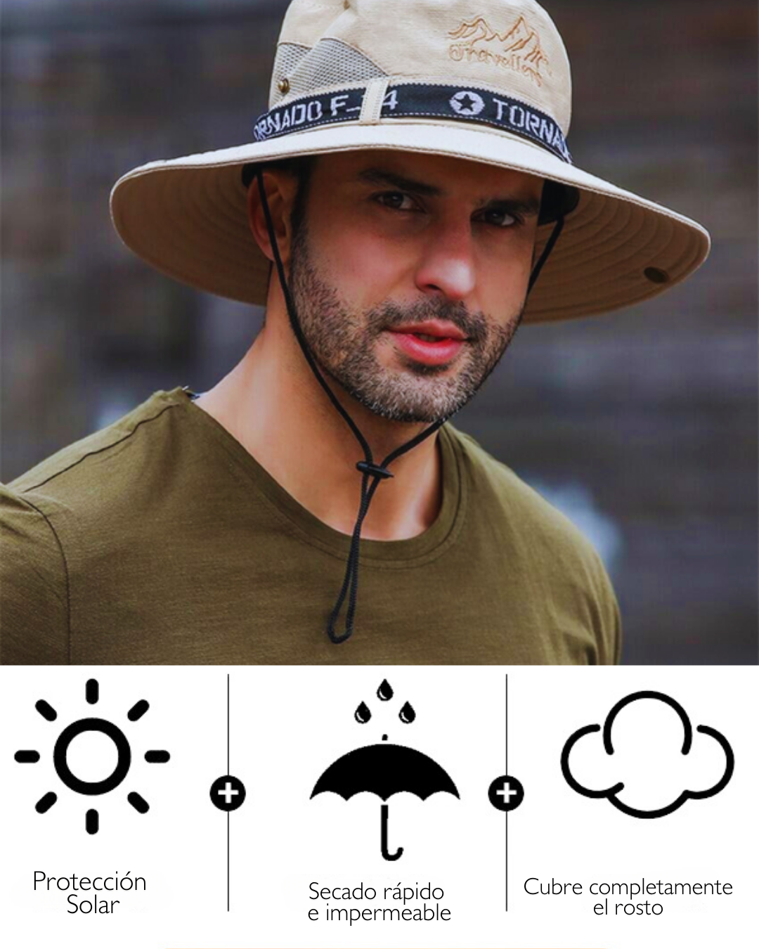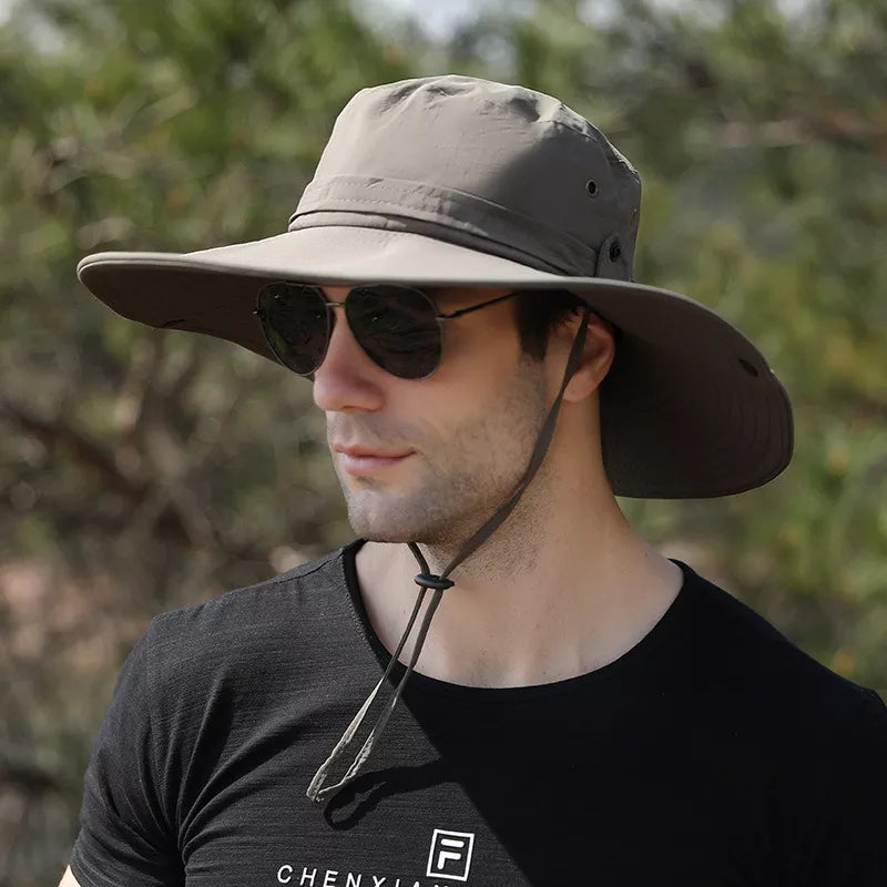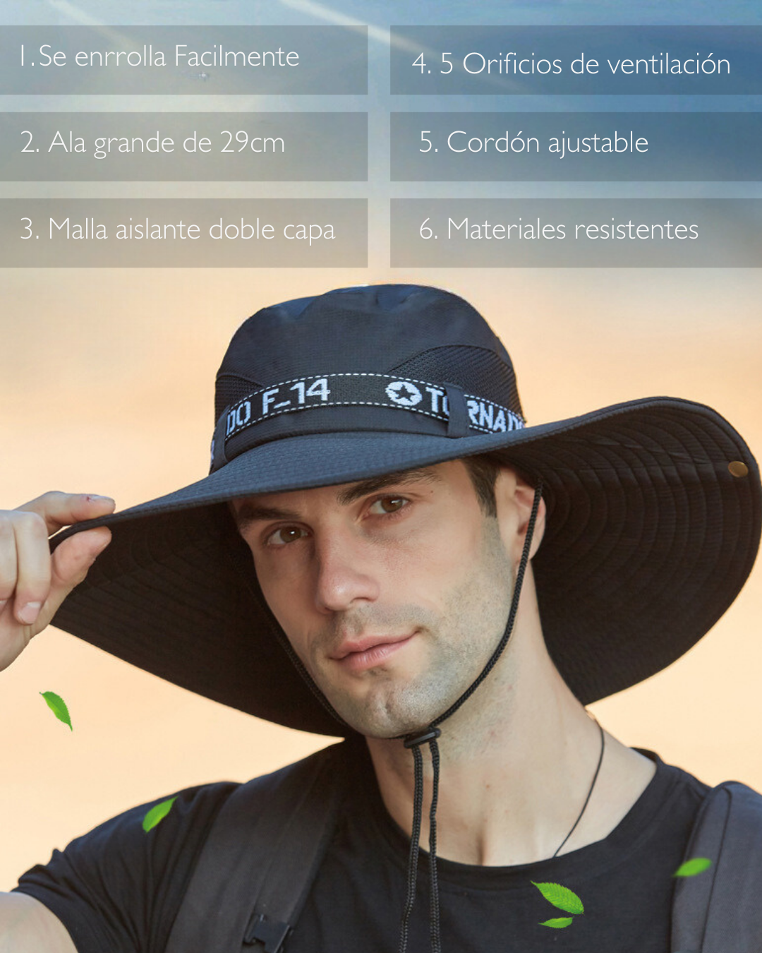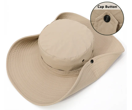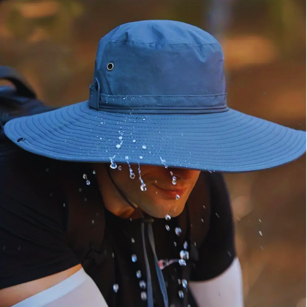 Sombrero de ala ancha, ultraligero y diseñado para protegerte de los rayos del sol. Su estructura incluye orificios de aire en la parte superior, lo que permite una excelente transpiración para mantenerte fresco. Además, cuenta con un cordón ajustable en la parte inferior para evitar pérdidas. Como toque adicional, tiene dos botones en los costados de la copa que te permiten doblarlo, ofreciendo un estilo diferente y versátil al diseño convencional.